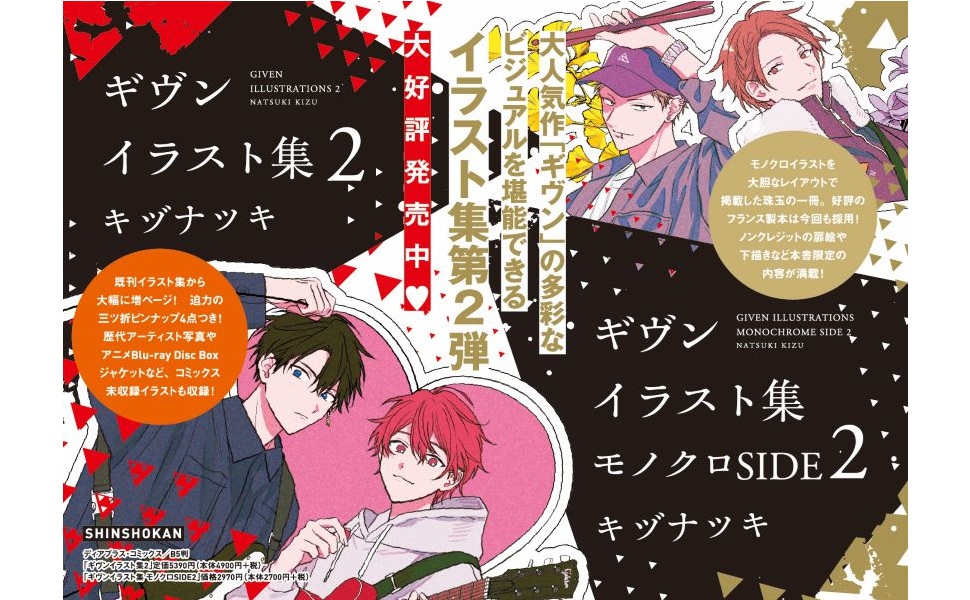 アーティスト写真や「ギヴン Blu-ray Disc BOX」の描き下ろしジャケットをはじめ、アニメ『ギヴン』シリーズのために描かれた貴重なイラスト、さらにコミックス未収録のカラーイラストも多数収録。