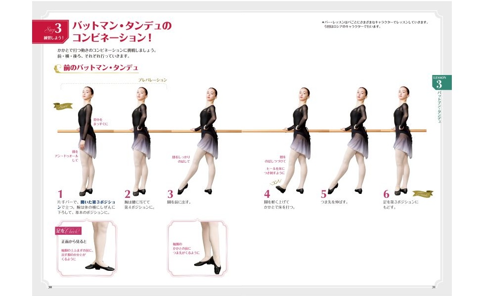 足と腕のポジションから始まり、バー・レッスンを網羅。